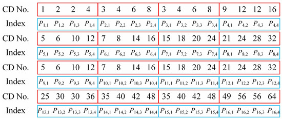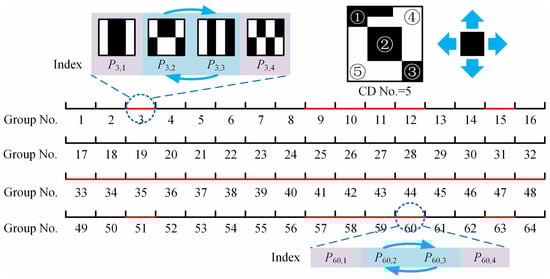 Step 3: Adjust the pattern sequence to ensure that the number of CDs for each pattern in the ith group is in an incremental order. Here, a CD is defined as an up-down-left-right connected area consisting of equal values (see the upper right corner of Figure 2, which is just an example to illustrate how a CD works, but not related to the actual patterns used). The neighborhoods on both sides of the axis may cause the partition of CDs, which is worth of investigating. Let us first look at the pattern whose pixel values on both sides of the symmetry axis are the same, its contribution to the recovery is the largest in the ith group. Since the pattern needs double symmetric reverse folding, its number of CDs is largest (with lowest reconstruction contribution) in the ith group. The patterns and are produced by only once symmetric reverse folding, whether to first perform up-down or left-right operation is approximately equivalent, thus they are particularly worth considering. As shown in Figure 2, the patterns and with a group indication (ID) (note: not the absolute subscript) need to be order-reversed for the case of , while those with a group ID require adjustments for the case of . This rule also exists in the higher-order cases. Given this, we set fourfold as a level. From top to bottom, the total groups (as a whole) can be catalogued into four parts: only the second part remains unchanged, the groups in the third part all need to be adjusted, while the groups in the first and fourth parts also need to be adjusted but with the same group IDs, depending on the recursive layer. Then, repeat the operation for the first part (as a new whole) until the number of groups in each new quarter part equals to 1. In the last layer, only the third part needs to be adjusted. Then, switch the order of the patterns and in these found groups.