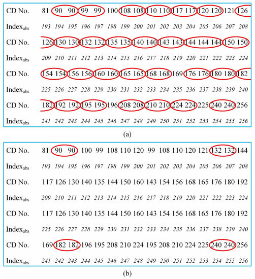 If we perform left-right and up-down reverse folding to generate and in Step 1, respectively, then the ID positions should be adjusted accordingly in Step 3. After the above three steps, we will get the final pattern sequence. Figure 3 gives an example of the final pattern sequence for . In order to deeply analyze the advantages of our method, we compare it with the RD method. It is interesting to find that these two approaches have similar numbers of CDs in the low-order part (especially for the first 16 patterns, they are the same). Since their subsequent results are both derived from these first 16 patterns, it is advisable to set each 16 patterns as a comparison unit. Figure 4 shows the differences in their high-order parts (the last 64 patterns in 256-order sequence which also comprises the largest division of the RD method). As shown in Figure 4a, the RD ordering becomes very rough in this part, and has a lot of pattern pairs with the same number of CDs in each comparison unit. Because the maximum partition length of RD is and its minimum segmentation length is 4, it will inevitably incur too much uncertainty. Although the internal order exchange in these pattern pairs does not affect the RD sorting too much, it does bring hundreds of millions of possibilities of finding the optimal pattern sequence to get the best imaging quality, while in our scheme, each four patterns are treated as a group, i.e., the partition length is always 4. As shown in Figure 4b, there are only four red marks in our method for the high-order part, with only uncertainty. An intuitive explanation is that we rearrange the patterns into groups, each of which comprises four patterns, since the folding projections are implemented in the entire part or the first half part of one previous pattern with only four limited combinations. Fewer patterns with the same number of CDs in much smaller groups may make our method more accurate. Further mathematical interpretation will be the focus of our future work.