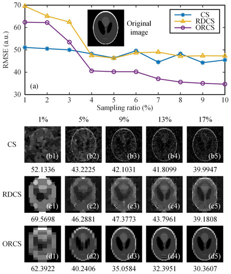 To test whether the measurement data acquired by our sensing method can generate better reconstruction performance than other approaches, some numerical calculations were performed. All calculations were performed on an ordinary laptop with an Inter Core i7-8650U central processing unit (CPU) @ 1.90 GHz and a random access memory (RAM) of 16 GB. For a fair comparison, we also combined the RD ordering of the Hadamard basis with CS, instead of second-order correlation used in the original version [21], and we call it the Russian dolls compressed sensing (RDCS). In the first simulation, a head phantom image on a black background of pixels was used as an original image, thus, the reconstructed images also had resolutions of pixels. In Figure 5, for conventional CS, we used a totally random 0/1 binary measurement matrix, which is widely applied in SPI schemes because the digital micromirror device (DMD) can only be encoded with 0/1 patterns. For implementing positive–negative light intensity modulation with the matrices consisting of positive and negative binary numbers, one needs to make a differential measurement between two patterns, which requires twice the actual amount of measurements. That is, to align to a 100% sampling rate of 0/1 random matrices, we should double the 50% sampling rate of positive-negative matrices. All sampling rates below were calculated in this way. The RMSE curves of CS, RDCS and origami compressed sensing (ORCS) as a function of the sampling ratio (from 0.5% to 10%) were given in Figure 5a, and their retrieved images at different sampling ratios from 1 to 17% with a 4% stepping increase are presented in Figure 5(b1–d5). All these methods show a similar trend that the image quality is approximatively proportional to the sampling ratio. For the small sampling ratios, conventional CS and RDCS perform very similarly. When the sampling ratio is large enough, the RDCS will perform better than traditional CS. From the data, it can also be seen that the performance of our method outperforms those of CS and RDCS for the simple object. For this case, only 9% measurements are enough for ORCS to obtain a nice reconstruction. The reason why ORCS exhibits less noise than RDCS is that ORCS performs the reordering of the Hadamard matrix with only four patterns in each group, and its sort is much more refined than that of RDCS.