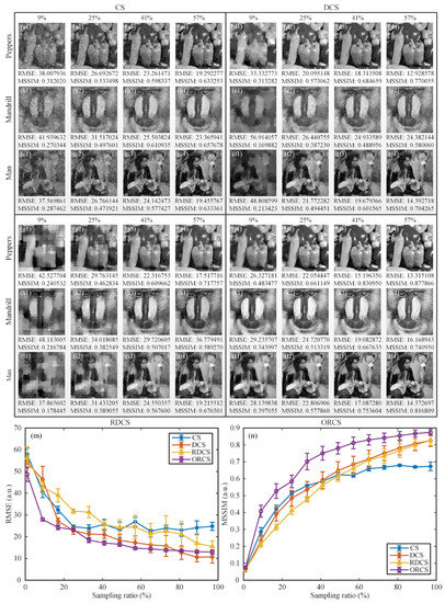 The reconstruction comparisons of CS, DCS, RDCS and ORCS for more general scenes at the sampling ratios of 9%, 25%, 41% and 57% are presented in Figure 6(a1–c4,d1–f4,g1–i4,j4–l4), with the RMSE and MSSIM values being indicated below each image. In terms of images and performance evaluation parameters, we can clearly see that the image quality of ORCS is much better than those of other three approaches under the same sampling ratios. We further drew their RMSE and MSSIM curves of recovered images as a function of the sampling ratio, as shown in Figure 6m–n. Although the scene has more spatial complexity, the performance trends of these methods keep in accordance with the case of simple object. From Figure 6n, we can see that the performance of ORCS is generally better than the other three methods with an overwhelming superiority for all sampling ratios, while the reconstruction quality of RDCS and DCS is very close, which is coincident with the theory of RD [21]. In other words, to acquire the same reconstruction quality, our ORCS requires a sampling ratio that is much closer to the upper bound specified by the phase transition of CS reconstruction. In addition, when the sampling rate is below 49%, CS, DCS and RDCS behave similarly, while for the sampling ratios above 49%, both RDCS and DCS outperform the traditional CS. This is because both the RDCS and DCS actually realize positive–negative intensity modulation, and the RD reordering of the Hadamard matrix is too rough, thus, the RDCS cannot show obvious advantages over the DCS. When the sampling ratio is large enough, the RMSE and MSSIM values of all approaches tend to saturate.