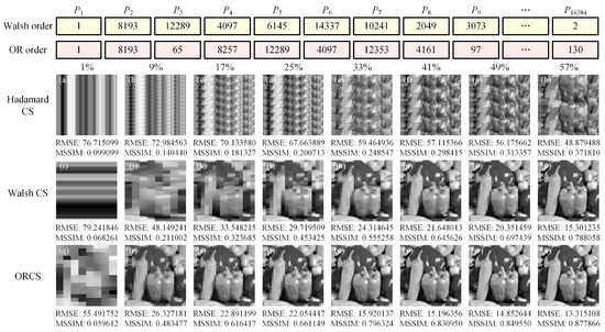 The proposed method provides an alternative row-reordering of the Hadamard matrix. To compare with the classic Walsh–Hadamard patterns, we gave the pattern number of each Walsh–Hadamard pattern and origami pattern with respect to the original sequence of natural-ordered Hadamard patterns, as shown in Figure 7. As we know, the Walsh-ordered Hadamard matrix also performs row-reordering of natural-ordered Hadamard matrix, by rearranging the rows based on an increasing order of the number of sign changes of each row via the bit-reversal permutation followed by the Gray-code permutation. Therefore, whether in principle or in the reordering sequences, the origami sort and the Walsh sort are different. Next, we presented the image reconstructions using natural-ordered, Walsh–Hadamard patterns and origami patterns, respectively, as shown in Figure 7a–x. It is obviously seen from the recovered images that when we perform the subsampling, their reconstruction results are definitely different from each other. When using the natural-ordered Hadamard patterns, there exists some periodic silhouette ghosting in the recovered images, caused by the periodic structure of the matrix itself. When using the Walsh–Hadamard patterns, the reconstructed images at low sampling ratios have horizontal stripes. Our origami patterns can avoid these negative effects and yield relatively better performance. Now, let us delve into the essence of our method. As we know, the Hadamard patterns generally have various spatial frequencies. In each group of the origami patterns, the front patterns have a smaller number of CDs (i.e., larger blocks), forming the low-frequency components (rough contour) of the object, and the following patterns have a larger number of CDs (i.e., smaller blocks), contributing to the high-frequency components (details) of the target. Since the first origami pattern in the ith group is derived from the ith origami pattern in the complete sequence, the mean of the number of CDs in each group is also increasing with the group number. Therefore, patterns with a smaller group number capture low-frequency features of the object image, while those with larger group number will supplement the details of high-frequency components. This explains how our method works and why it outperforms the others.