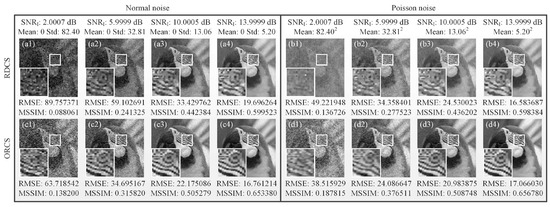 Next, we simulated the influence of illumination fluctuation noise on image reconstructions. As we know, in mathematical models, all noise in SPI system can be regarded as the additive noise, thus, the effects of different noise sources involved in the imaging process are similar. Here, we directly added the illumination fluctuation noise [38] on the target to be detected. The SNR of the spatial light field distribution of illumination fluctuation noise can be calculated by , where Std signifies the standard deviation. Two kinds of noise which follow the normal and Poisson distributions are set for both RDCS and ORCS methods. In Figure 8, compared with RDCS, the details of reconstructed images using ORCS is much easier to identify from the enlarged part of the white square frame in the lower left corner of each image, under the same for either of the above two types of noise, and the image quality gradually improves with the increase of the value.