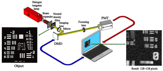 Our experimental realization was based on a conventional single-pixel camera, as shown in Figure 9. The thermal light from a stabilized halogen tungsten lamp with a wavelength of 360∼2600 nm was collimated and attenuated via a beam expander and a neutral density filter (NDF), respectively. Here, the NDF was used to attenuate the light to the ultra-weak light level. The attenuated light passed through a negative 1951 USAF resolution test chart, and then was imaged onto the DMD (one SLM) via an imaging lens and a mirror. The applied DMD consists of micromirrors, each of which can be switched between two directions of , corresponding to 1 and 0. Since the values of our patterns are either 1 or , we needed to divide each generated pattern into a complementary matrix pair [35,36,37] and , which was sequentially encoded on the DMD. A counter-type Hamamatsu H10682-210 PMT was placed on one of the reflection orientations to accordingly make a differential measurement of two adjacent total photon counts. By using the ORCS method, we acquired a very satisfactory image quality, as shown in the right illustration of Figure 9. For comparison, we also gave the experimental results of RDCS and ORCS at different sampling ratios, as presented in Figure 10. It can be easily seen that the image quality is proportional to the number of measurements, and our ORCS outperforms RDCS, which is consistent with the simulation results. When we perform full sampling, the performance of RDCS and ORCS will be almost the same, because their measurement matrices in this case only have inconsistencies in the row order. In our experiment, the sampling frequency of the PMT is set to 500 Hz. For the object of pixel-size with a total sampling ratio of 32%, it only takes 10.49 s for both RDCS and ORCS to finish data acquisition and takes 31.90 s (averaged calculation time) for image reconstruction running on an ordinary laptop, i.e., the total imaging time is 42.39 s. It is worth mentioning that the maximal binary pattern switching rate of the DMD is 32550 Hz, if we set the working frequency of the PMT to 32550 Hz and use a computing device with a better configuration, the total imaging time can be further reduced.