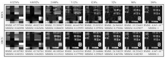Experimental results of RDCS and ORCS under varying sampling ratios changing from 0.3276% to 200% with a stepping increase. The RMSE and MSSIM values are also given, treating the reconstructed image with full sampling as a reference image. The image quality progressively improves with the increasing number of measurements.