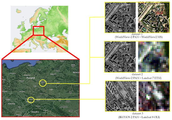 This often results in spectral distortions and/or blurred image after the fusion. The panchromatic image acquired by IKONOS satellite has a twice lower spatial resolution than the panchromatic image acquired by the WorldView-2 satellite, so the spatial details are mapped less precisely in it. The choice of such data sets allowed the verification of the proposed approach for various GSD ratios (from standard to very high) and different spatial resolution of a high-resolution image. All data show areas in Poland. Sets 1 and 2 represent a lowland area, with a highly urbanised area of the capital of Poland (Warsaw). Whereas, set 3 shows the upland area, which is medium urbanised and partly forested. All testing images are 1200 by 1200 pixels. Data sets are shown in Figure 1.