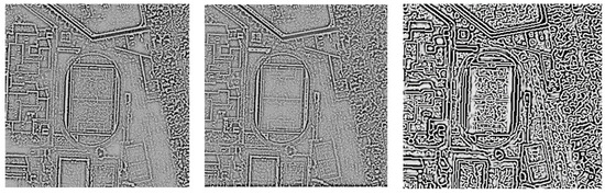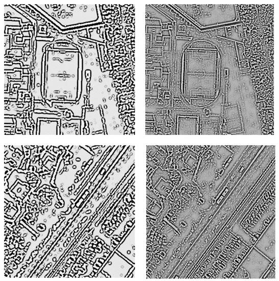 Achieving high ability to objects identification requires an appropriate method of spatial objects selection. The most popular way to extract details in the image is high-pass filtration. The simplest filters are gradients that are based on the first derivative, and operate directionally. They are suitable for detecting linear elements. For detection of non-linear objects, non-directional Laplace filters based on the second derivative are recommended. Both are the basis for many methods of extracting details in the image. One of the most common filters for edge detection is the Canny filter [34] that applies the Sobel convolution in the vertical and horizontal direction after the image denoising with the Gaussian filter with a kernel of size 5 × 5. Next, the directions are calculated and aligned to the angles of 0°, 45°, 90° and 135°, after which non-maximum suppression and hysteresis thresholding lead to the final detection of the edges. Canny’s filter, as well as most of the filters, gives good results when detecting clearly visible edges. The edge in the image is defined as a sudden change in the signal frequency, and therefore, the higher the contrast around the edge, the easier it is to identify. In the satellite images often have narrow edges (1–2 pixels) and places where the contrast between the background and the narrow edge is too low. Enhancing such edges is essential for achieving the high interpretative -ability of pansharpening, especially in the case of data with a high GSD ratio. The approach described in this manuscript involves the development of a filtration method that will allow enhancing spatial details, in particular, linear objects with a width of 1–2 pixels.