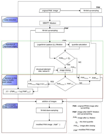 The flowchart (Figure 3) shows the subsequent stages of the proposed solution for the pre-processing of the PAN image. The Logarithmic-Laplace filtration (LL) was used to detect the edges in the image after up-sampling and denoising (PAN’). The application of logarithmic function during filtration highlighted the narrow edges that initially did not stand out on the background. Then, the conditional function based on quantiles allowed for the selection of edges of significant importance and the elimination of edges that do not bring substantial information about spatial details. The image closing process (the erosion of dilatation) not only eliminated small and irrelevant elements of detected edges but also allowed to obtain the continuity of some narrow edges. In this way, a mask with edges was developed, which formed the basis for a decision on how to modify pixels of the PAN image. If the value of the pixel did not exceed the third quartile and the value of the pixel in the original denoised image, then the pixel value of the PAN image did not change. When one of the conditions was not fulfilled, the new pixel value was calculated as the logarithm of the pixel value in the denoised image. The average of these images gave a modified panchromatic image, which was then used in pansharpening process. The downsampling process allowed to return to the original pixel size.