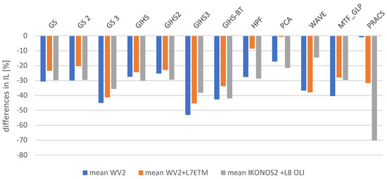 Spatial quality was assessed using the Laplacian Index IL% [41] The assessment was made for all spectral channels in the visible, near-infrared and mid-infrared range for each tested dataset. The graphs (Figure 4) show the average change in the IL% for the tested datasets. These values determine the change that occurred after applying the panchromatic image modification (mod) used in the pansharpening process in relation to the classical approach (class).