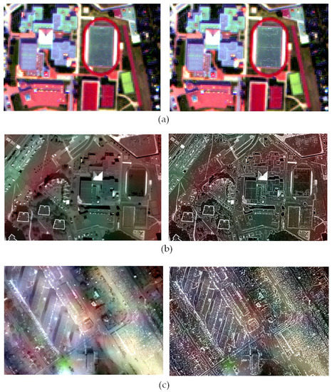 Results of pansharpening using the GIHS3 method in the classic approach (left) and modified (right) images acquired by satellites (a) WorldView-2 (b) WorldView-2 and Landsat 7 ETM (c) IKONOS-2 and Landsat 8 OLI.