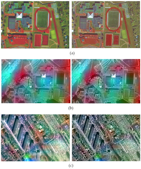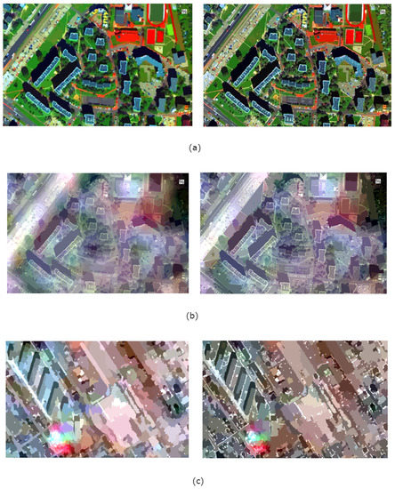 Figure 9 shows the results of segmentation (in natural colours) performed on images after fusion using the PCA method in a classic and modified approach. The solutions used in the modification of the panchromatic image allow for better identification of the objects’ edges, which is the basis for object discrimination during the segmentation process. The higher the spatial resolution of the panchromatic image, the greater the potential for segmentation improvement. The visibility of the edges in the high-resolution image allowed for easy detection of road lines, details on the buildings’ roofs and distinction of the pitch parts (Figure 9a,b). In addition, edges sharpening allows for better identification of object shapes, which can be mainly observed for buildings (Figure 8c). The shapes are more regular and match the real ones. The modification of pixel of the edges allowed the automatic detection of some narrow paths between buildings, which after fusion in the classical approach were challenging to identify even for the skilled analyst.