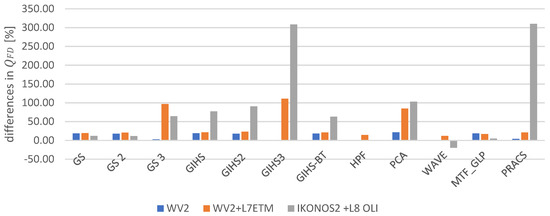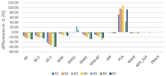 The difference in the value of the Q ratio in subsequent image bands (B1, 2, …, 7) for different pansharpening methods after comparing the classical approach and modified for the data obtained by IKONOS-2 (PAN) and Landsat 8 OLI (MS) expressed as a percentage of the values from the classical approach.