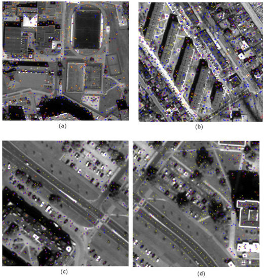 Figure 8 presents characteristic points detected in the original panchromatic image (marked with a blue star), characteristic points identified in the image after the fusion according to the classic approach (red circle) and characteristic points detected in the image after the image fusion according to the modified method (yellow cross). Many points are located in similar positions on each image, but there are also differences in the number and location of points detected in subsequent images of the same area. Characteristic points identified in the original PAN images occur in different places; they do not always represent essential details. In the fused images, points were found in other locations than on the PAN image, which is the result of different radiometry of the images, and therefore features determination was affected. In the image after the fusion in the classical approach fewer points representing easily identifiable details were detected than in the PAN image. However, after a fusion using the modified approach, the number of characteristic points generally increases and sometimes exceeds the number of points in the PAN image.