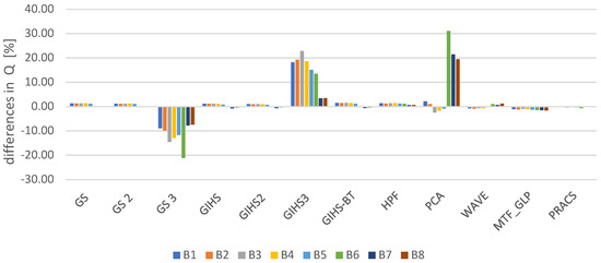 The difference in the value of the Q ratio in subsequent image bands (B1, 2, …, 8) for different pansharpening methods after comparing the classical approach and modified for the data obtained by WorldView-2 (PAN and MS) expressed as a percentage of the values from the classical approach.
