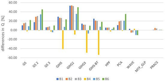 The difference in the value of the Q ratio in subsequent image bands (B1, 2, …, 6) for different pansharpening methods after comparing the classical approach and modified for the data obtained by WorldView-2 (PAN) and Landsat 7 ETM (MS) expressed as a percentage of the values from the classical approach.