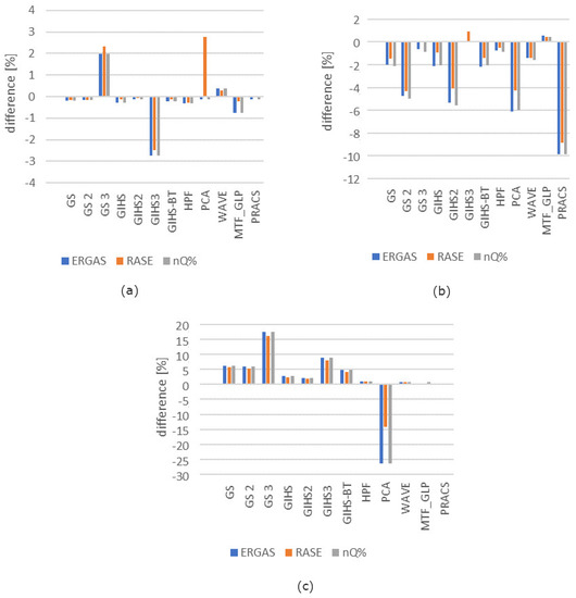 The difference in the value of the ERGAS, RASE and nQ% for different pansharpening methods after comparing the classical approach and modified for the data obtained by IKONOS-2 (PAN) and Landsat 8 OLI (MS) expressed as a percentage of the values from the classical approach for datasets (a) WorldView-2 (b) WorldView-2 and Landsat 7 ETM (c) IKONOS-2 and Landsat 8 OLI.