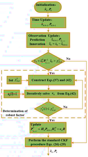 In this paper, a novel robust CKF with scaling factor is developed to address the influence of abnormal observations on system state estimate. If the judging index is not greater than , the standard CKF will be carried out, otherwise a scaling factor , which is also called the robust factor, will be introduced to inflate the observation noise covariance . Accordingly, the predicted innovation covariance for the proposed robust CKF should be changed to: