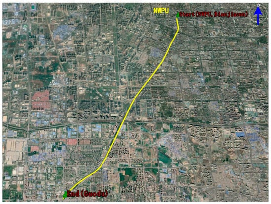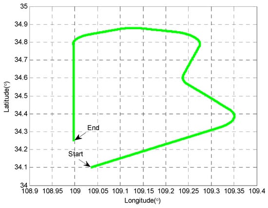 The experiment of terrestrial vehicular navigation was conducted near the Youyi Campus of Northwestern Polytechnical University (NWPU) at the city of Xi’an, Shaanxi, China. The start point of the experimental vehicle was at North latitude , East longitude and Altitude 412 m. After the initialization of the INS/GNSS integrated navigation system for 5 min, the experimental vehicle started to move towards the Southwestern direction at the velocity of 5 m/s and terminated at the Guodu station (at North latitude , East longitude , Altitude 429 m). The movement trajectory of the experimental vehicle is depicted in Figure 11. The vehicle travelling time is about 2000 s, and the vehicle travelling distance is about 11 km with the average velocity of 20 km/h.