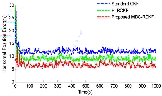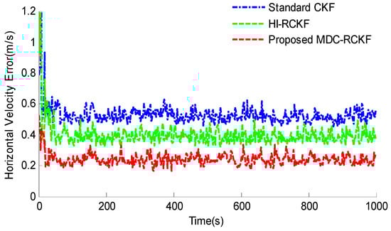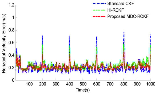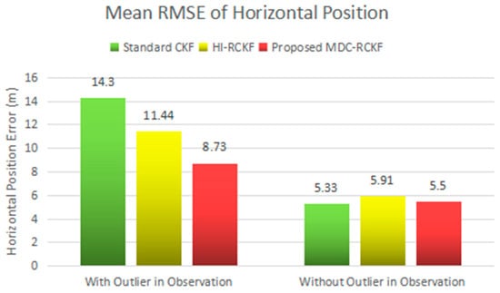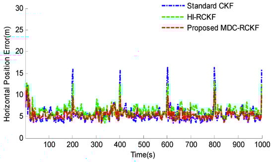 The intuitive comparison of the standard CKF, HI-RCKF and proposed MDC-RCKF for the mean RMSEs of both horizontal velocity and position are described in Figure 5 and Figure 6. The relevant results also illustrate that the proposed MDC-RCKF has better robustness to inhibit the outliers in observation comparing to the other filters. Thus, the proposed method can obtain a superior performance for vehicular INS/GNSS integration.