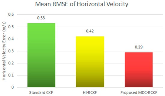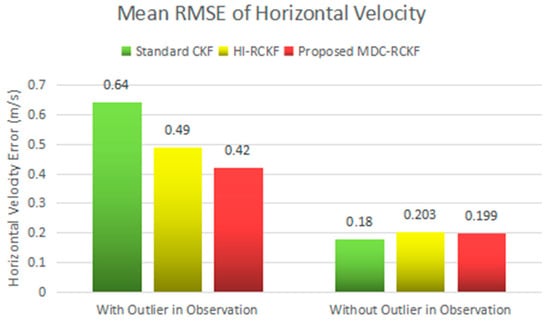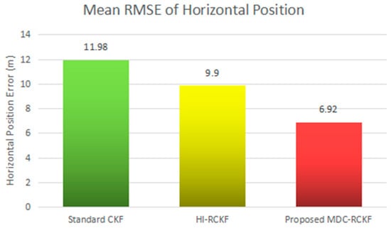 Figure 7 and Figure 8 depict the RMSEs of both horizontal velocity and position calculated by the standard CKF, HI-RCKF and proposed MDC-RCKF for the vehicular INS/GNSS integration with contaminated Gaussian noise distribution. The mean RMSEs of horizontal velocity and position obtained by the standard CKF, HI-RCKF and proposed MDC-RCKF in this case are also intuitively compared and shown in Figure 9 and Figure 10. Figure 7 Figure 8 Figure 9 Figure 10 illustrate a similar phenomenon as the case of outliers in observation. When the observation noise is perturbed by another Gaussian distribution, the horizontal velocity and position errors obtained by the standard CKF are largest among the above three filters, and its mean RMSEs in horizontal velocity and position are 0.53 m/s and 11.98 m, respectively. The accuracy of HI-RCKF is relatively superior to that of the standard CKF due to the ability to inhibit the contaminated observation noise distribution. The obtained mean RMSEs in horizontal velocity and position are 0.42 m/s and 9.90 m, which are 10.9% and 17.4% smaller than those of the standard CKF. As expected, the proposed MDC-RCKF has higher navigation accuracy compared to the standard CKF and HI-RCKF, leading to the mean RMSEs in horizontal velocity and position at 0.29 m/s and 6.92 m, which are 32% and 30.1% smaller than those of HI-RCKF, respectively.