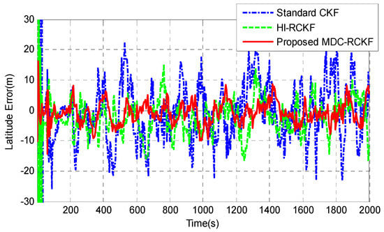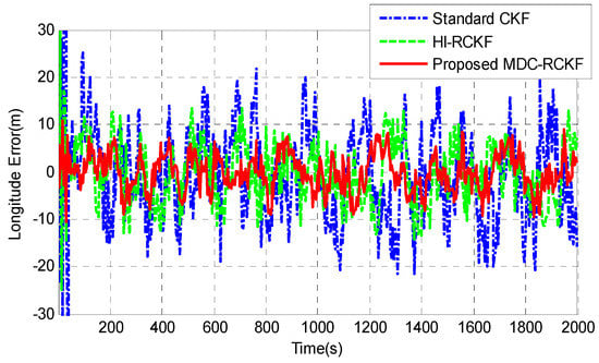 Figure 12; Figure 13 give the position errors in longitude and latitude of the vehicle by the standard CKF, HI-RCKF and proposed MDC-RCKF. During the test process, the GNSS signals were shielded by the tall buildings or tree canopies in the environment, leading to the outliers in observation. As shown in Figure 12; Figure 13, the solution of the standard CKF is severely disturbed by the abnormal observations in the environment, leading to the largest position errors in longitude and latitude, which are within (−21.57 m, 21.77 m) and (−23.02 m, 22.14 m). HI-RCKF has better navigation accuracy than the standard CKF, leading to the position errors in longitude and latitude within (−14.45 m, 13.53 m) and (−16.73 m, 15.02 m). However, obvious oscillations still exist in the longitude and latitude error curves of HI-RCKF. Compared to the standard CKF and HI-RCKF, the position errors in longitude and latitude obtained by the proposed MDC-RCKF are much smaller, which are within (−9.42 m, 8.74 m) and (−10.04 m, 8.89 m), respectively.