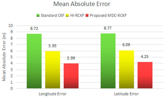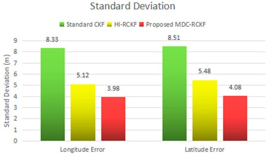 The mean absolute errors (MAE) and the standard deviations (STD) of the position errors in longitude and latitude for the comparison of the standard CKF, HI-RCKF and proposed MDC-RCKF are intuitively described in Figure 14; Figure 15. These results also verify that the proposed MDC-RCKF is capable of enhancing the filtering robustness and outperforms the standard CKF and HI-RCKF in terms of positioning accuracy in the presence of abnormal observations for the vehicular INS/GNSS integration.