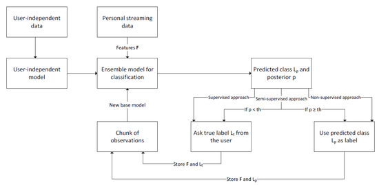 As Figure 1 shows, the labeling of the incoming streaming data can be done with three different approaches: non-supervised, semi-supervised, and supervised. The semi-supervised approach was originally introduced in [19]. The idea is that predicted labels with high posterior and data related to them are used in the model update process as they are, but labels with a posterior confidence below some threshold, , are considered as uncertain, and they are labeled by the user before they are used in the model updating process. Moreover, as the studied activities are of long-term [26] nature, it can be assumed that also the windows right before and after have the same class label as the window labeled by the user. In this study, it is assumed that if the label of window w is a, then also windows , and belong to class a. This way, one user input gives information to more than one window, improving the accuracy of the labels used to update models.