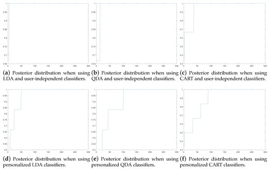 Figure 2c,f show the posterior distribution of the user-independent model and a personalized model, which contains three user-independent base models as well as three personal base models. Based on these figures it can be noted that it is not wise to use always the same threshold value . Instead, in the first place, when the classification is based on the user-independent model, it is wise to use a high threshold and when personal streaming data is obtained, and personal base models are added to ensemble, the used threshold should be lower. Therefore, it was decided that in this article the threshold value of is used when the ensemble consists only user-independent models and the threshold value of is used when the ensemble includes at least one personal base model.