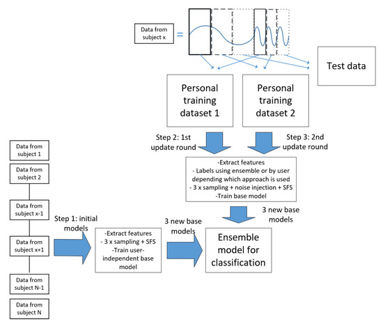 Step 2 is to start personalizing the ensemble model by extracting features from the first part of subject x’s data, which is bordered with a solid line. This data is labeled using the non-supervised, semi-supervised, or supervised approach. In this experiment, a problem with the data chunks used to personalize the recognition process is that they are rather small. Thus, they do not contain much variation leading easily to over-fitted base models. To avoid over-fitting, the noise injection method presented in [28], is applied to the training data sets to increase the size of training data and increase its variation. After this, a data set used in model training is selected based on random sampling (in this case, sampling with replacement and the number of sampled instances is , where is the personal training data set 1 from subject x), and SFS is applied to it to select the best features. The new base model is then trained using the selected features and added to the ensemble model, which is again tested using subject x’s data bordered with a dotted line. Step 2 is repeated three times to provide more variability to base model set.