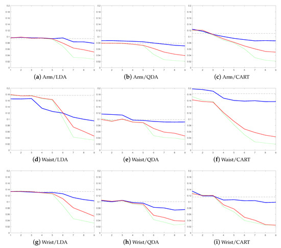 Results using Shoaib data from three body positions: arm, waist, and wrist. Adding new base models to Learn++ decreases the error rate (=1-balanced accuracy). The error rate is shown in the y-axis and the x-axis shows the number of used base models. The first row shows the results when the sensor position is the arm, the second from the waist position, and the third from the wrist position. The first column shows results using LDA, the second, QDA, and the third, CART. The results of the static user-independent model are shown using a horizontal line, the non-supervised using a blue solid line, the supervised with a green solid line, and the semi-supervised with a red dotted line.