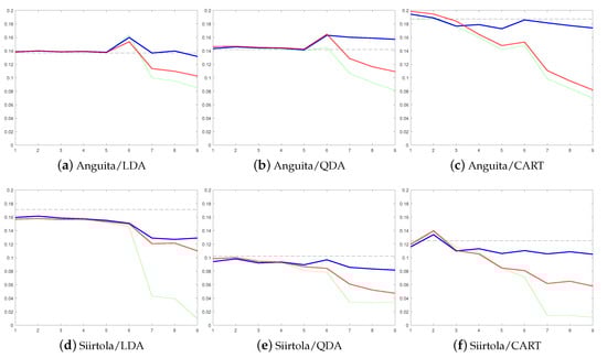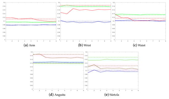 The results obtained with the Anguita dataset are not as convincing as the ones obtained using the other two datasets used in the experiments. The reason for this is that Anguita dataset is much smaller than the Siirtola and Shoaib datasets when it comes to the amount of data per subject per activity. For instance, the Anguita dataset contains only 30 s of walking data per study subject while the Siirtola and Shoaib dataset have much more walking data per study subject, for instance the Shoaib dataset has at least 3 min of walking data from each subject. In the case of Anguita data, the small amount of data means that the model does not have enough information to properly adapt to the new user’s moving style, and therefore, the error rate of the ensemble does not decrease as rapidly as with other two datasets. This is the most evident in the case of the non-supervised approach, which does not provide any advantage to the user-independent model. In fact, in the case of the QDA classifier, the error rate of the non-supervised approach is even higher than the user-independent model’s error rate, see Figure 5b. This example shows that incremental learning based on personalization requires enough data to work as it should, and fast adaptation is not as efficient as slower adaptation. However, it can be seen that small datasets also benefit from non-supervised and supervised personalization.