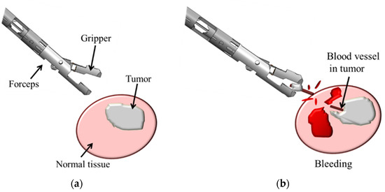 Importance of blood vessel detection during tumor resection. (a) No blood vessels are apparent on the target tumor. (b) Rupture and bleeding from the hidden blood vessel occur upon pulling the tumor.