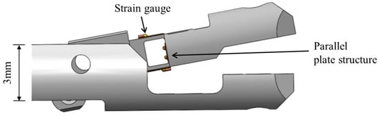 The robotic system is a master–slave system that uses bilateral control, in which the slave manipulator moves following the master manipulator and provides feedback for the force detected by the slave manipulator to the master manipulator. Force is detected by a gripper with a force sensor at the tip of the slave manipulator (Figure 3). The force sensor has a parallel plate structure and uses strain gauges (Kyowa Electric Industry, KFRS-02-120-C1-N50C2) to detect the gripping and pulling forces. Force in each direction is measured by a bridge circuit using four strain gauges: two active gauges that measure bending strain and two dummy gauges for temperature compensation. This is because the gripper is very small and there is no space to place four strain gauges for each type of force. Resistance of the strain gauge changes due to temperature changes in the measurement environment. The resistance change due to temperature change is measured by two strain gauges that are not subjected to bending strain. By correcting the resistance change measured by the two dummy strain gauges in the bridge circuit, the resistance change of the two active strain gauges, which are subjected to the bending strain, can be accurately measured. The parallel plate structure allows for the detection of bending strain in the gripping force direction without interference from other directional forces when force is applied to the tip of the gripper. The output of the gripping force sensor is 1V/1N from the amplifier, and the 16-bit A/D convertor accepts the input range of ±10 V. Sampling time is 5 ms. The manipulator that detects the gripping force is described elsewhere [22].