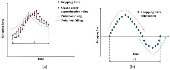 Extraction of pulse waveform using a second-order approximation value. (a) Gripping force data and second-order approximation value. (b) Extracted pulse wave.