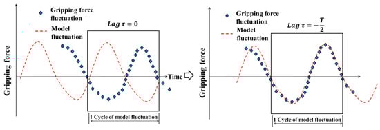 Curve-fitting is performed as follows: to calculate cross-correlation coefficients, the gripping force fluctuation model waveform for one cycle is used. The cross-correlation coefficient is defined by normalizing the cross-correlation function between the two fluctuation waveforms with auto correlation functions. The cross-correlation coefficient is given by