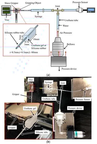 Experimental equipment. (a) Schematic view. (b) Picture (e.g., gripping object is urethane gel and silicone rubber tube).