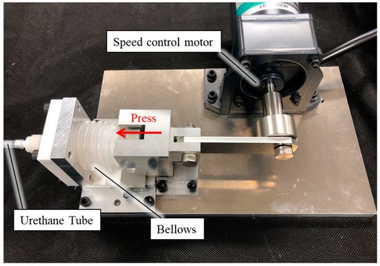 The device used to apply internal pressure fluctuation to the silicone rubber tube is shown in Figure 7. The bellows of the device were filled with air and connected to the silicone rubber tube via the urethane tube and a syringe. Water was added from the urethane tube to the silicone rubber tube. The silicone rubber tube was inflated when the water inside was pressurized by air from the bellows. The pressure in the silicone rubber tube was measured using a pressure sensor (SENSEZ, Inc. HTV_050KP_V) attached in the direction opposite the silicone rubber tube through the joint. A small artery was targeted for detection in this experiment. The systolic blood pressure for a small artery is approximately 110 mmHg (14.6 kPa) and the diastolic pressure is 70 mmHg (9.3 kPa) [29]. The pulse pressure, which is the difference between the diastolic and systolic blood pressures, is ~5.3 kPa. In this experiment, inflation of the blood vessel was reproduced. Considering the Young’s modulus of the silicone rubber tube, internal pressure fluctuation was applied to the silicone rubber tube at 11 kPa, which is nearly two times the actual pulse pressure.