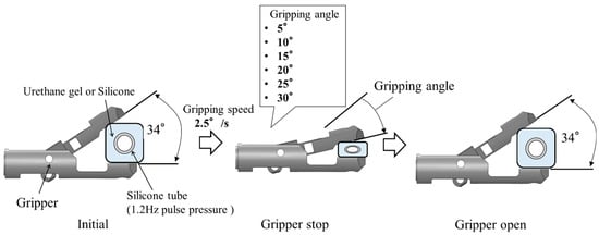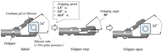 To evaluate the detection performance of the system, the effect of the pulsation signal on the gripping force data at various gripping angles was measured. In this experiment, the slave gripper was driven by directly controlling the actuator of the gripping motion. The schematic view of the experimental workflow is shown in Figure 8. The initial state of the gripper was opened at 34°, defined as a gripping angle of 0°, and in the next stage, the closing angle reduced from the initial angle was defined as the gripping angle. The gripping speed was constant, regardless of the target gripping angle. Six gripping angles were selected as targets. Regarding the gripping object, two different simulated tumors made of urethane gel and a silicone rubber were used. For both gripping objects, the silicone rubber tube inside the simulated tumor was pressurized at 1.2 Hz. The strength of the pulsation signal on the gripping force data at each gripping angle was evaluated based on the amplitude spectrum. Fast Fourier transform (FFT) was used to calculate the amplitude spectrum. For FFT, the gripping force fluctuation data were used.