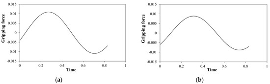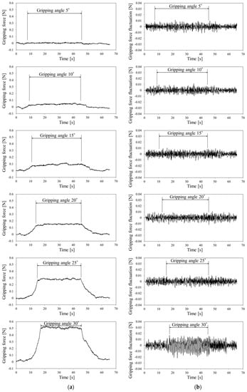 The gripping force data for the silicone rubber tube detected using the gripper force sensor at each target gripping angle are shown in Figure 10a. At 20° and 25° gripping angles with gripping forces of 0.4 and 0.7 N, respectively, the fluctuation wave appeared in the gripping force. However, the wave disappeared at the 30° gripping angle with a gripping force of 1.1 N. The gripping force fluctuation for the silicone rubber is shown in Figure 10b. The amplitude of fluctuation waveforms was markedly high at 15°–25° gripping angles but low at 30°.