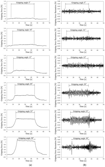 The gripping force data detected by the gripper force sensor at each target gripping angle are shown in Figure 9a. Using the 30° gripping angle with a gripping force of 0.5 N, a minute periodic waveform appeared on the gripping force between 17 and 45 s. The gripping force fluctuations detected at each target gripping force (by subtracting the second-order approximate value) are shown in Figure 9b. The amplitude of fluctuation waveform was markedly high at the 30° angle.