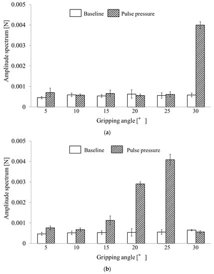 FFT was performed to determine whether the gripping force fluctuations were pulsation waveforms and to collect the gripping force fluctuation data at a constant gripping angle interval (window size, 4096; sampling interval, 5 ms; 20–40 s). The amplitude spectrum for the 1.2-Hz component was selected as the amplitude spectrum for the pulsation signal because the silicone rubber tube was pressurized at 1.2 Hz in this experiment. The amplitude spectrum for urethane gel detected at each target gripping angle compared with the baseline without pressurization of the silicone rubber tube is shown in Figure 11a. Error bars represent standard deviation. The amplitude spectrum was markedly high at the 30° gripping angle.