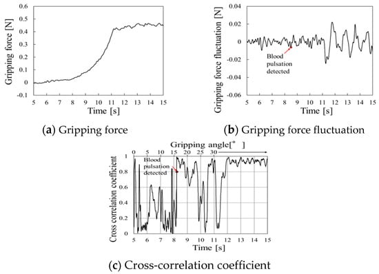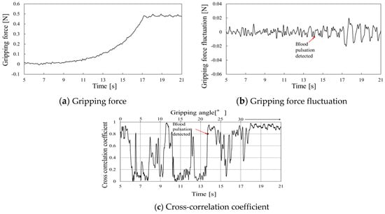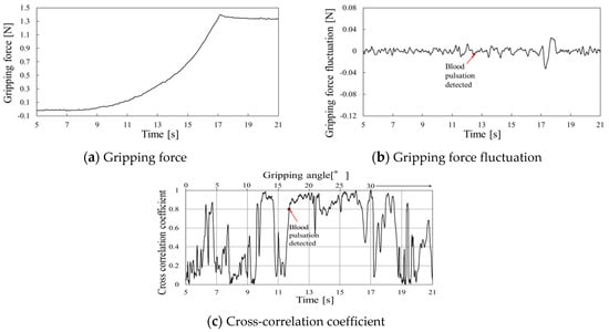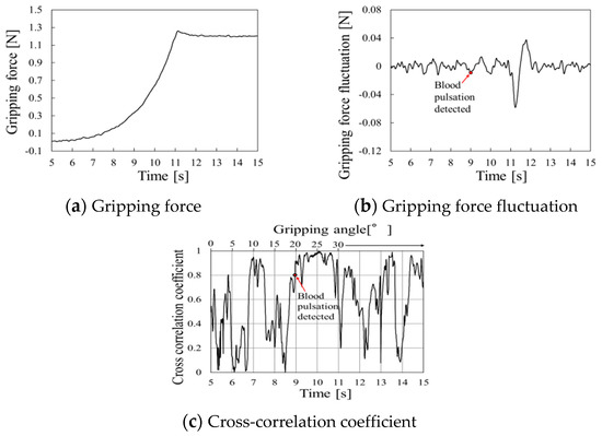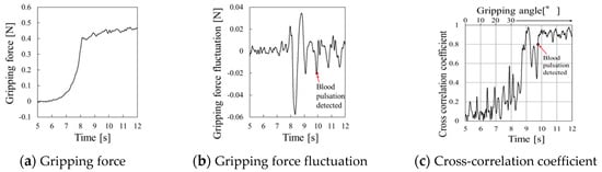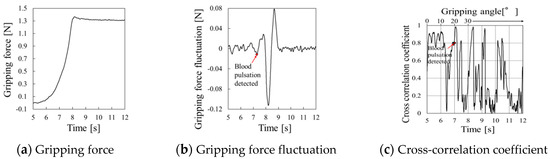 Periodic waveforms caused by pulse pressure are shown in gripping force fluctuations from 12 to 17 s in Figure 17b. Periodic waveform disappeared after 17 s because the pulsation disappeared when the gripping angle reaches 30° in the case of silicone rubber, as shown in Section 4. Moreover, the cross-correlation coefficient remained high from 12 to 16 s (Figure 17c). This period was considered as the pulse-detected time.