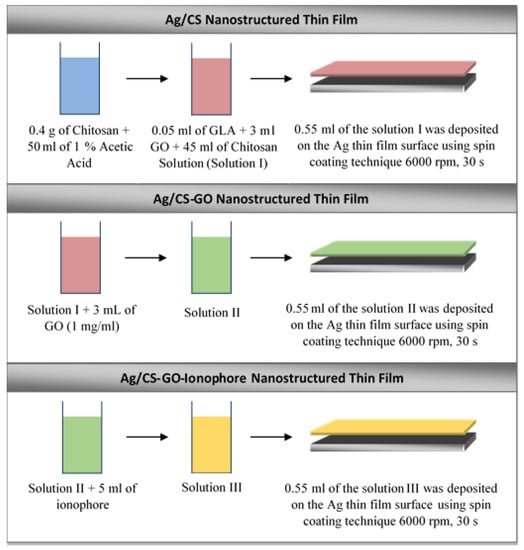 Three samples of Ag/CS, Ag/CS-GO, and Ag/CS-GO-Ionophore nanostructure thin films were prepared on top of the glass substrates, separately. The glass substrates, which have a 24 mm × 24 mm dimension area and 0.13–0.16 mm thickness range, were obtained from Menzel-Glaser. The glass substrates were cleaned using acetone to ensure that the surface was free from any impurities. A thin silver film (~50 nm) was deposited on top of the substrates using a PVD 75 Sputter Coater controlled by a film thickness monitor. The substrates were located at 35 mm from the silver foil target (99.99% in purity) and deposited at a rotational speed of 10 rpm for 360 s. The sputter deposition was carried out with a power of 50 W under an argon pressure of approximately 5 × 10−3 Torr at room temperature.
