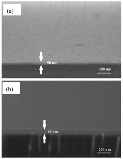 Next, approximately 0.55 mL of solution I, II, and III was coated on the surface of the silver thin film substrates, separately, using a Laurell Technologies WS-400BX-6NPP spin coater. The spin coater was operated at 6000 rev/min for 30 s. Figure 1 shows the schematic procedure of the fabrication process for Ag/CS, Ag/CS-GO, and Ag/CS-GO-Ionophore nanostructure thin films. Meanwhile, Figure 2 shows the field emission scanning electron microscope (FESEM) images of the Ag thin film’s thickness on the surface of the glass substrate before and after being coated with the sensing material layer. The FESEM image in Figure 2a confirms that the thickness of Ag on the glass substrate is 50 nm, where it is reported that the SPR sensor performance is optimum at this metal thickness [19]. After the addition of the sensing material film, the thickness of the nanostructure thin film increases by approximately ~68 nm, as shown in Figure 2b. The thickness of the sensing materials is approximately similar for all the three solutions used.