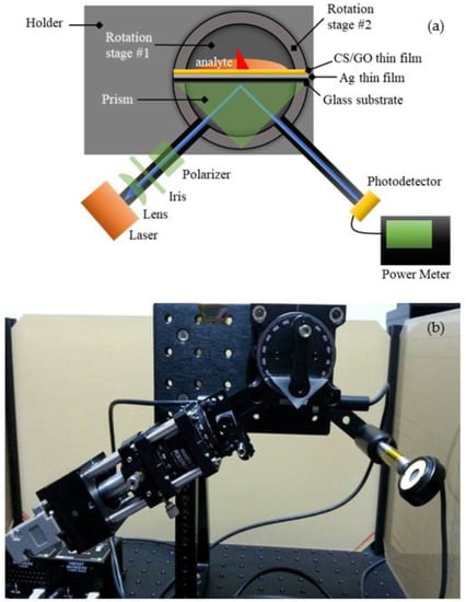 SPR reflectance were measured using an SPR setup that was equipped with an 850 nm laser light source, as shown in Figure 3. The laser light source is incident on a metal film in contact with a prism, and its reflectance is detected with a photodetector. The setup consists of a prism, two rotation stages, a laser, a lens, an iris, a polarizer, a photodetector, and an optical power meter. The nanostructure thin film samples were attached to the uncoated right-angle prism (N-BK7, Thorlabs, Newton, NJ, USA) using a refractive-index-matching gel (glycerine). An analyte, such as a Pb(II) ion solution, was placed on top of the sample. The prism was positioned separately on top of a motorized rotation stage with two worm drives (CR1/M-Z7E, Thorlabs). The rotation stage was utilized to rotate the laser light and the photodetector (S120VC, Thorlabs) corresponding to the measured angle. An 850 nm wavelength vertical-cavity surface-emitting laser (VCSEL, Thorlabs) with 1 mW output power was employed to transmit light into the right-angle prism. The transmitted light was coupled using an aspheric lens (C240TME-B, Thorlabs), which was then optimized with an iris (SM1D12, Thorlabs) and polarized using a polarized beam splitter (PBS202, Thorlabs), such that only p-polarized light passed through the prism and made contact with both the thin film and the analyte. The change in the reflected light corresponds to the SPR reflectance of the nanostructure thin films interacting with the analytes, and it was detected using the photodetector and measured using the optical power meter (PM100D, Thorlabs). Pure deionized water and different concentrations of Pb(II) are tested as analytes on top of the Ag/CS, Ag/CS-GO, and Ag/CS-GO-Ionophore nanostructure thin films. The SPR reflectance of different analytes is presented as an SPR curve, which represents the sensitivity of the SPR sensor.
