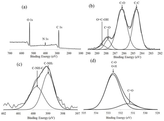 Figure 4 shows the XPS analysis for the CS-GO nanocomposite thin film. Figure 4a shows the overall chemical compositions that are present in the CS-GO thin film, which consists of O 1s, N 1s, and C 1s elements. It was observed that the O 1s element was the highest amount of element present in the CS-GO thin film, which was contributed by both chitosan and graphene oxide. The high amount of O 1s element in the CS-GO thin film provides many active sites for the adsorption of Pb(II) ions [28]. In Figure 4b, the C–C binding at the 284.6 eV peak corresponds to the sp2 hybridized. Meanwhile, the C–O (286.2 eV) and C=O (287.8 eV) correspond to the carbonyl functional group, and the O=C–OH (288.5 eV) corresponds to the carboxyl functional group [29]. The N 1s spectra in Figure 4c shows that C–NH2 (398.9 eV) and C–NH–C (399.8 eV) are attributed to the amine and amide functional groups in the chitosan structure, respectively [30]. The presence of C=O (531.2 eV), C–O, and O–H (532.5 eV) functional groups in Figure 4d confirms the successful synthesis of the CS-GO nanocomposite [31].