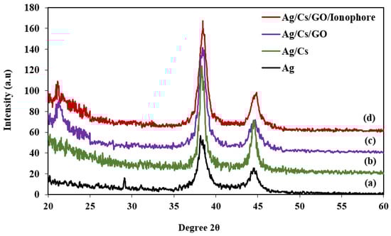 X-ray diffraction (XRD) spectra for (a) Ag, (b) Ag/CS, (c) Ag/CS-GO, and (d) Ag/CS-GO-Ionophore nanostructure thin films on the surface of the glass substrate.