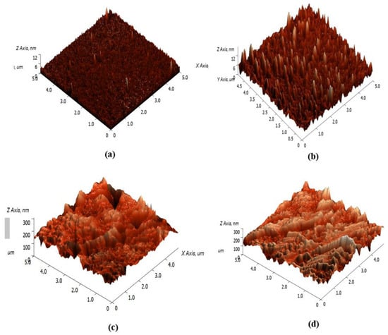 Atomic force microscopy (AFM) images of the (a) Ag, (b) Ag/CS, (c) Ag/CS-GO, and (d) Ag/CS-GO-Ionophore thin films.