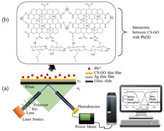 (a) Proposed sensing mechanism for the detection of Pb(II) using CS-GO as an active layer for surface plasmon resonance (SPR) sensors and (b) the chemical interaction between CS-GO with Pb(II).