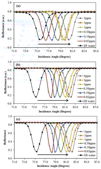 The SPR curves for the Ag/CS, Ag/CS-GO, and Ag/CS-GO-Ionophore thin films toward pure deionized water and different concentrations of Pb(II) are presented in Figure 8a–c, respectively. Pure deionized water and six different concentrations of Pb(II) in the range of 0.03 to 5.00 ppm were prepared. The initial incidence angle was measured when the thin film made contact with the pure deionized water, and a new incidence angle appeared with different concentrations of the analyte. The incidence angles occurred at the minimum reflectance and were illustrated by the SPR curve. Taking the initial incidence angle as a baseline and comparing to the new incidence angle, the difference in the incidence angle (∆θ) over the concentration of Pb(II) will be calculated as the sensitivity of the SPR sensors.