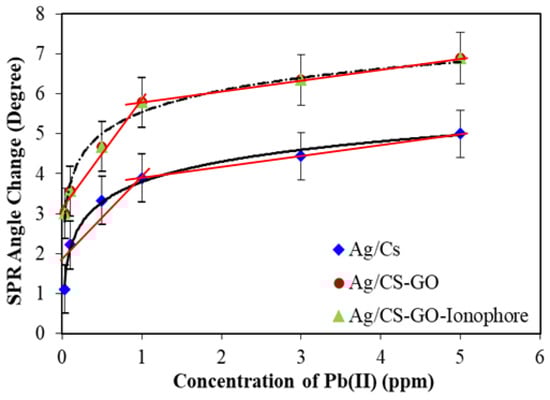 Based on this result, it is suggested that the addition of GO greatly enhanced the sensitivity of the SPR sensor without the use of ionophore. Previously, it is reported that Ag thin films in SPR are unstable and easily become oxidized when used without a protective layer, hence affecting the sensor performance. However, in this work, a good sensitivity was obtained, which was mainly due to the application of CS-GO as the sensing layer for Pb(II) ions, since at the same time, it plays an important role as the protective layer for Ag.